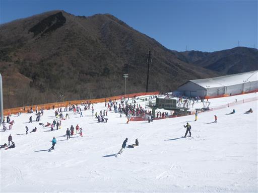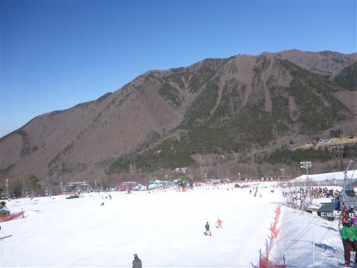 このスキー場は人工雪スキー場。周囲の山々にはあまり雪が積もっていない。
