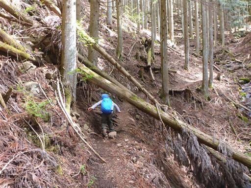 登山道を塞ぐ倒木。子供は楽だが大人は通過しにくい。