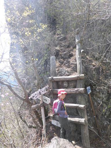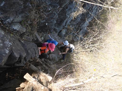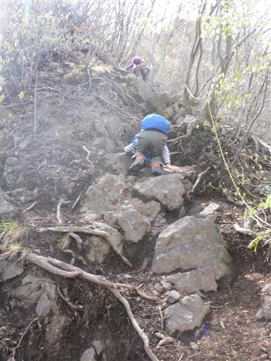 鎖場を慎重に下山。息子はまだサポートが必要だ。