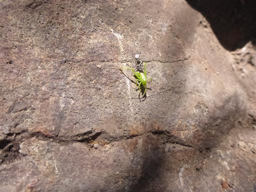 蟻が自分の体より大きなキリギリスを運んでいる。