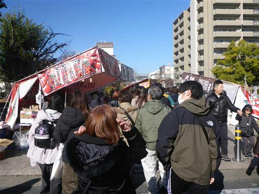 橿原神宮前駅から屋台が続いていて、大勢の人が訪れている。