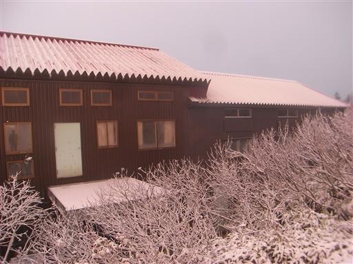高台から冷池山荘を見下ろす。全てが白く染まっている。
