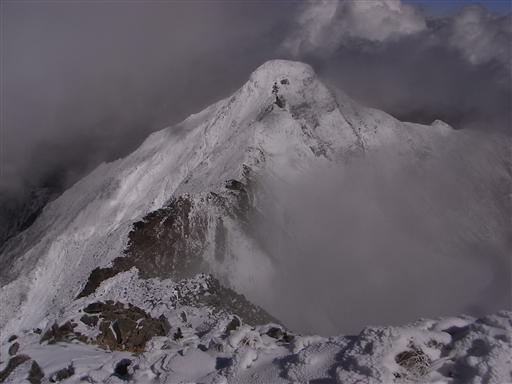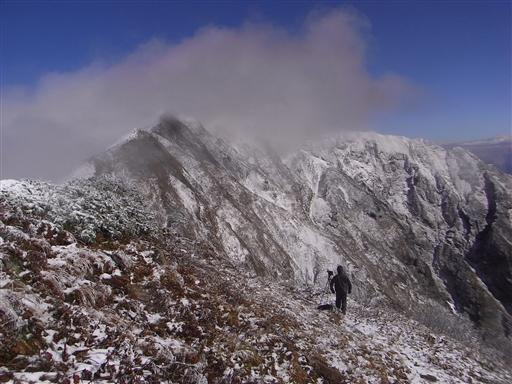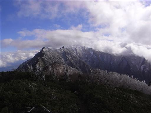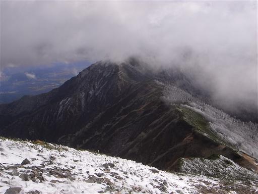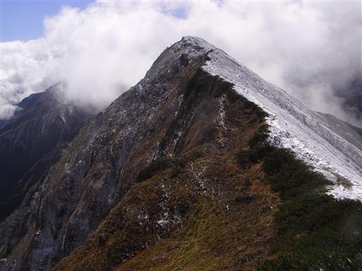 一瞬の雲の切れ間から、鹿島槍ヶ岳北峰が望めた。