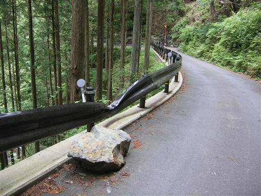 林道にはあちこちに落石がある。