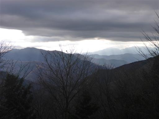 山頂から少し進んだところから展望が広がる。薄明光線が美しい。
