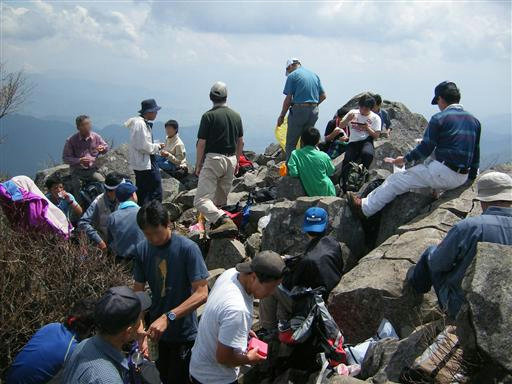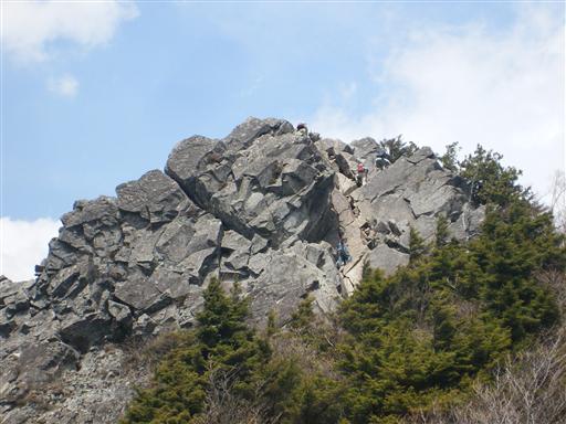 山頂の岩が見えてきた。鎖場を登っている人影が見える。