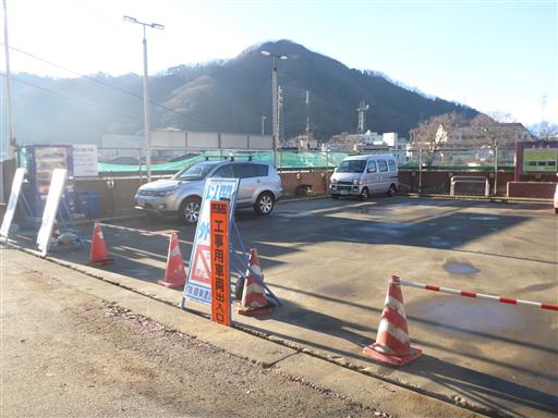 閉鎖されていて工事用車両が停まっている。