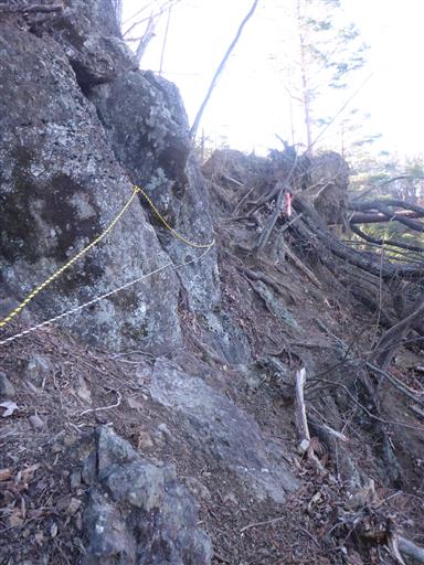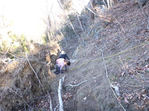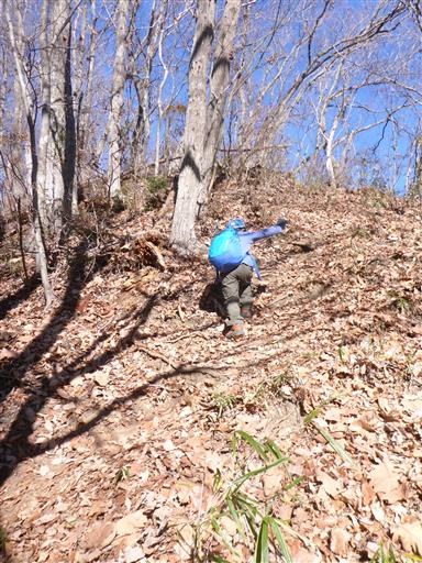 倒木の跡の滑りやすい斜面を登る。
