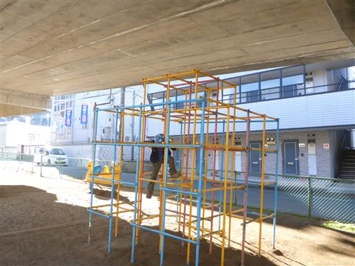 ジャングルジム。高架の下にある公園で、天辺に登ると天井に手が届きそうだ。