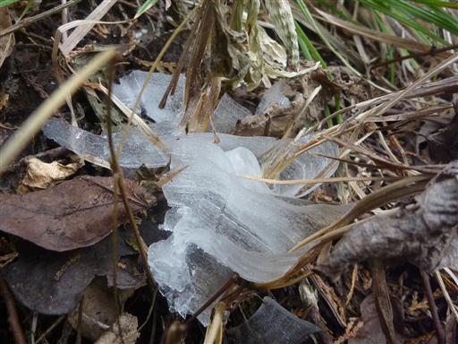 植物から出た水分が凍ってできた霜柱。非常に美しい。