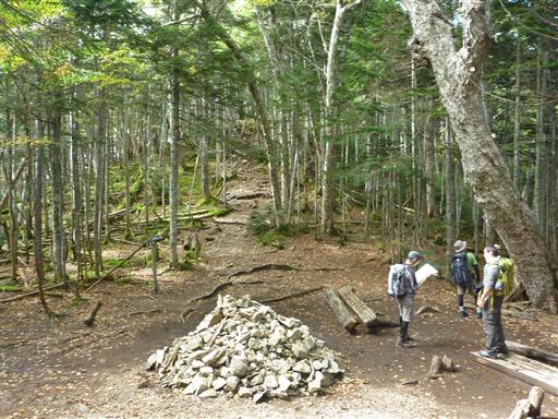 緩やかに続く尾根道を歩いていく。朝日峠に大きなケルンが積まれている。