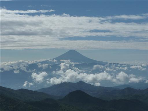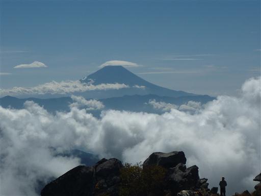 山頂からは360度の大展望が広がる。富士山は頭に笠をかぶっている。