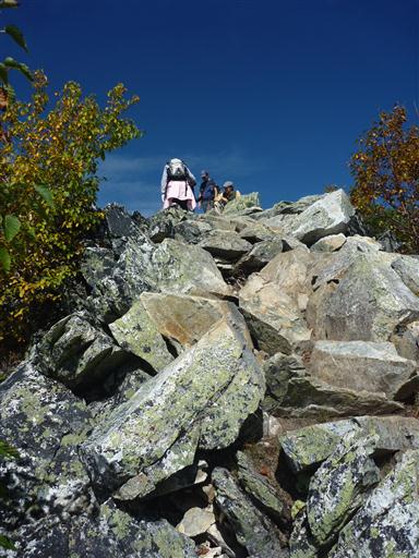 朝日岳に近づくと山頂直下は岩が積み重なっていて、一気に展望が広がる。