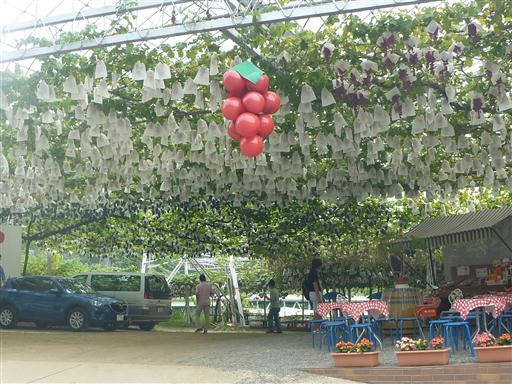 車から、あちこちにあるブドウ園を眺めながら帰る。山梨はブドウの名産地だ。