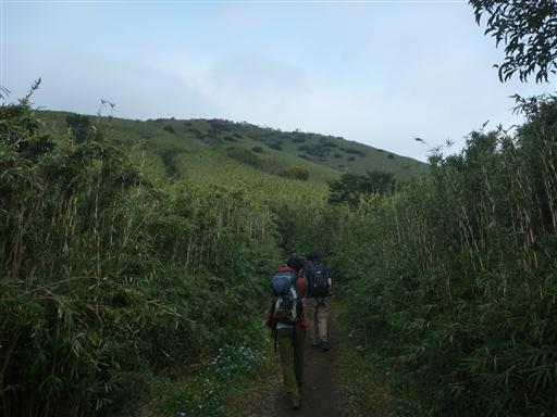 振り返ると笹原の中に一筋の登山道が見えている。