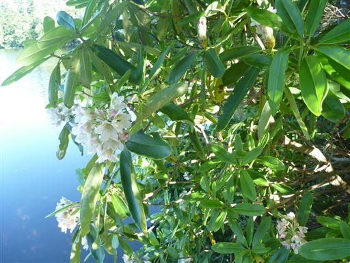 池畔にシャクナゲの花が咲いている。