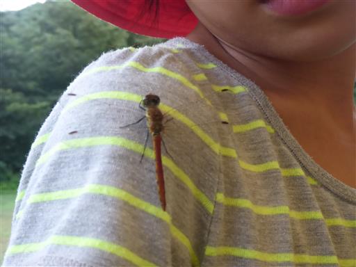 娘の肩にトンボが止まる。長い間動かなかったので娘はご満悦。