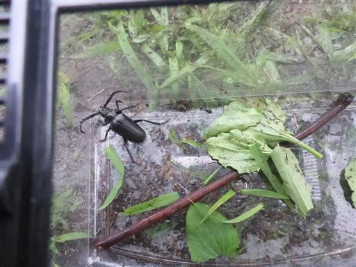 ノコギリカミキリだろうか?虫かごのツルツルの壁も少しは登ることができる。
