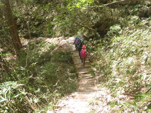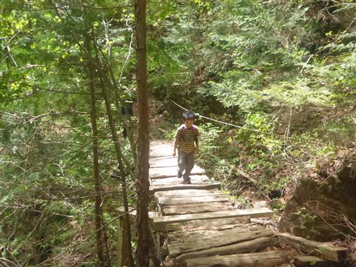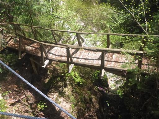 木橋。ちょっと古い橋で右側は崖のため歩くのが少々怖い。