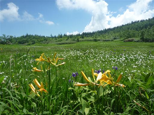 ニッコウキスゲとワタスゲ。ワタスゲは湿原一面に広がっていて見ごたえがある。