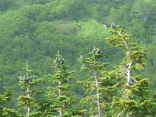 オオシラビソ。木のてっぺんだけに多くの実をつけている。