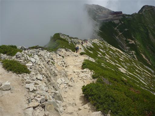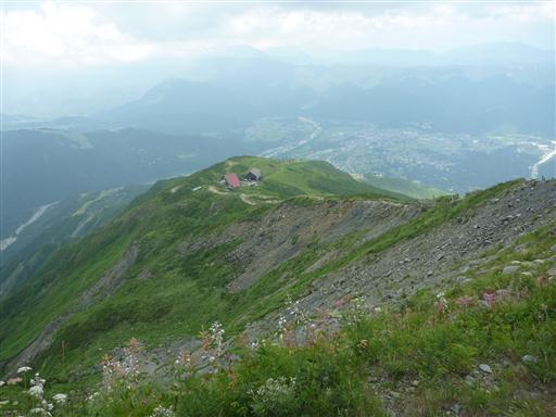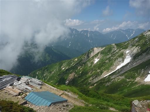 あとは元来た道を戻るのみ。八方尾根を延々と下ると雲の下に出てきて視界が広がる。