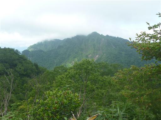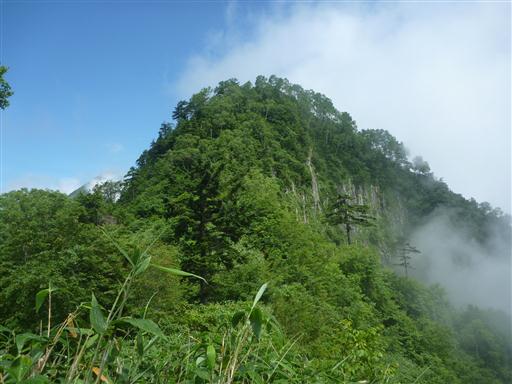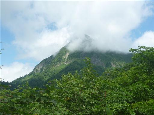 目の前に高妻山が迫る。山頂部が見えそうでなかなか見えない。
