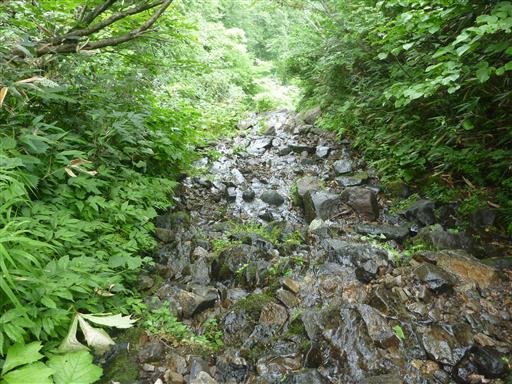登山道は完全な沢となる。小さな石が転がる沢を下って行く。