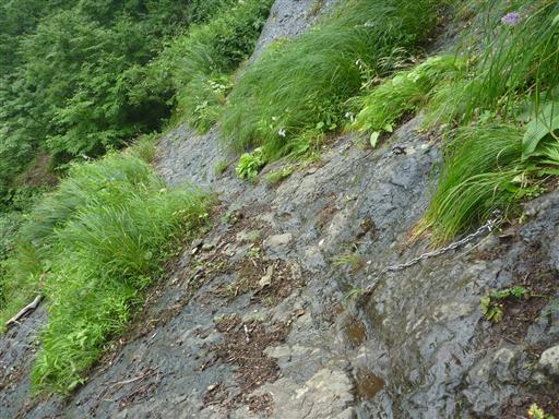 さらに岩壁をトラバースする。鎖は設置されているが足を滑らせると危険な場所だ。
