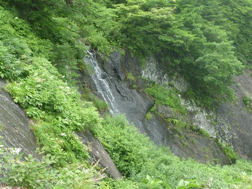 滑滝を見上げる。滝の右に鎖が設置されている。