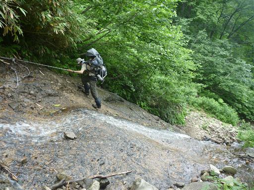 滑滝にかかる鎖場。傾斜は緩いがここも滑りやすいところだ。