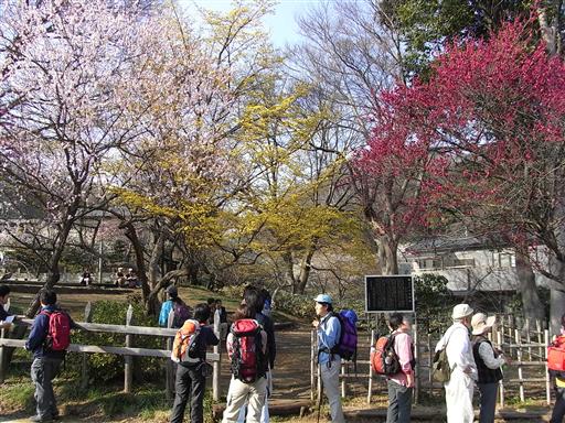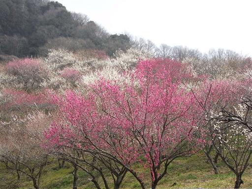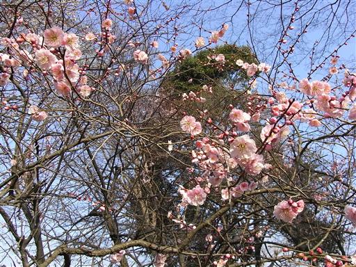 登山道入口付近には赤と白の梅の花がたくさん咲いている。