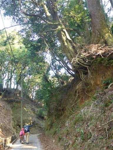 土が流れて木の根が露出している。今にも落ちてきそうだ。