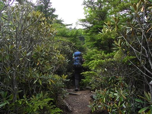 シャクナゲの藪の中を登っていく。この辺りのシャクナゲは有名で