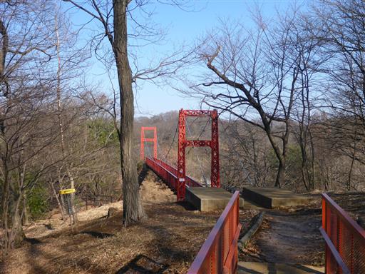 赤い吊橋を渡る。少し高台にあるため、この辺りは人気がない。