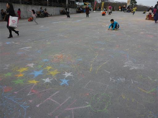 入場口付近はチョークの落書きコーナー。かなり広い範囲に絵が描かれている。