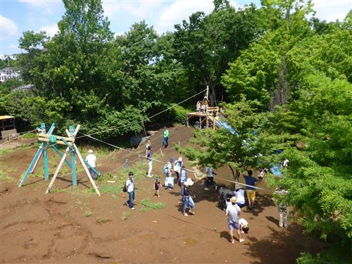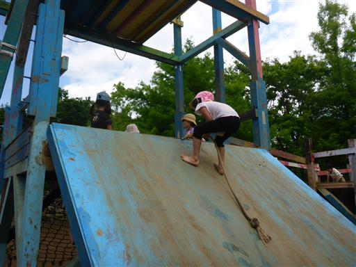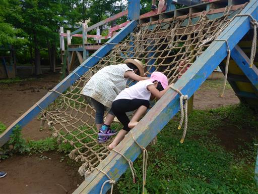 ネットを登る。この施設にある遊具は基本的に手造りだ。
