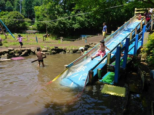 ウォータースライダーの先にある池。皆びしょ濡れだ。