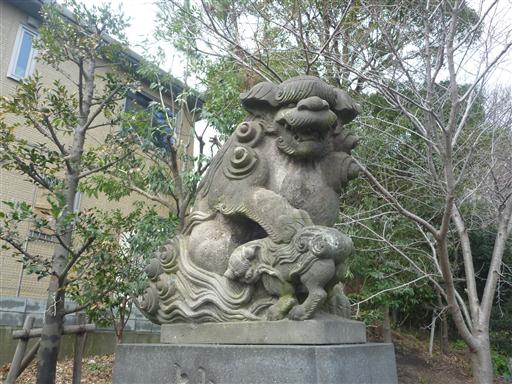鳥居の側の狛犬。子供の狛犬がかわいらしい。