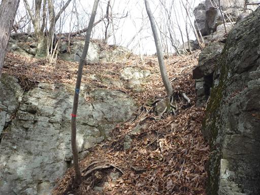 岩は左から回り込み、滑りやすい急斜面を登る。