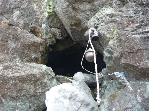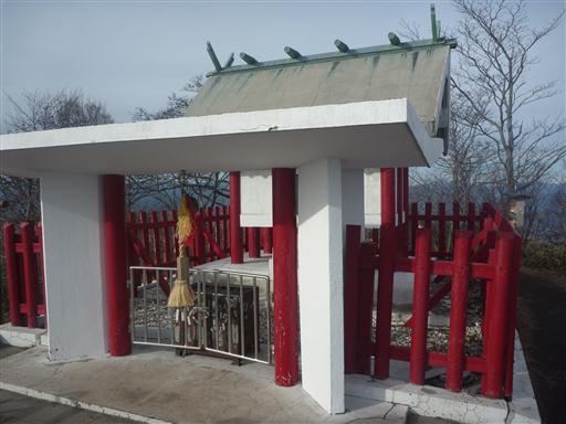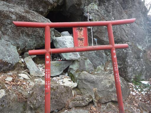 山頂直下の岩窟に到着。ここにも小さな赤い鳥居が立てられている。