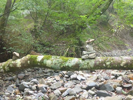 倒木に小さな石が積まれている。ここで本流から離れて左折する。