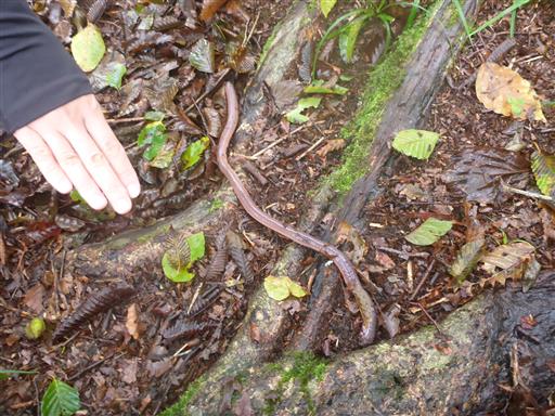 巨大ミミズ。誤って踏んづけてしまったのか、突っついてもあまり動かず元気がない。