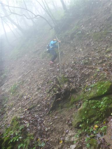 こちらも道が細い。登山道がほぼ水平でなく、背後は崖だ。