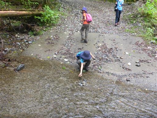 水量は少ないが、息子は石を並べて渡ろうとしている。