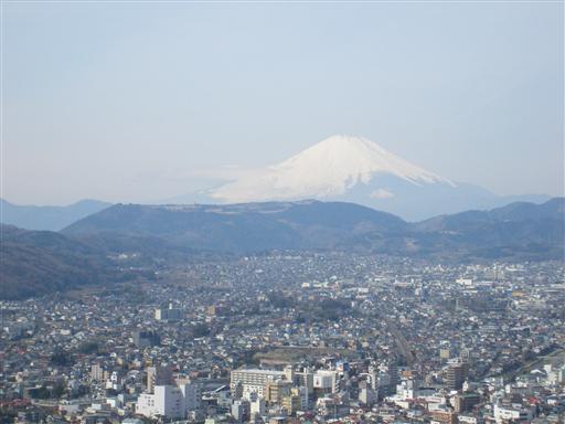 秦野市街の奥に存在感抜群の富士山が見える。