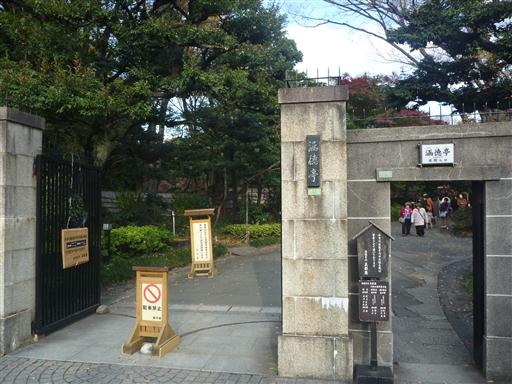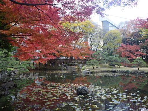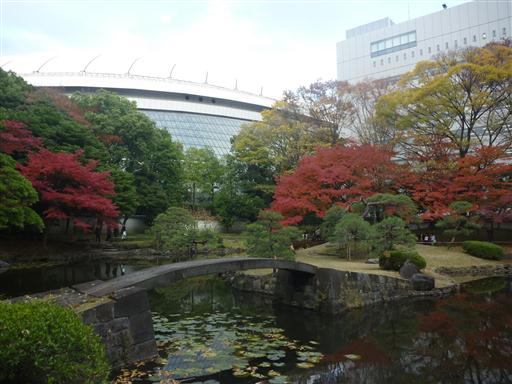 庭園の背後に東京ドームが見える。何やら不思議な光景だ。