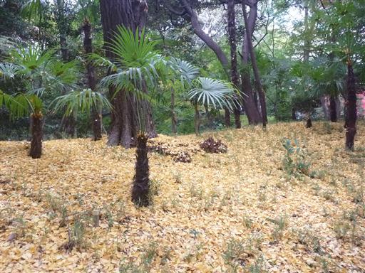 落ちたイチョウの葉が積もっている。