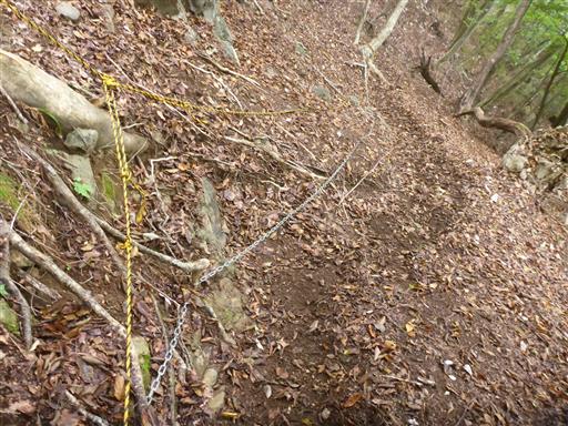 この辺りは滑りやすい斜面。トラロープの他に鎖まで設置されている。