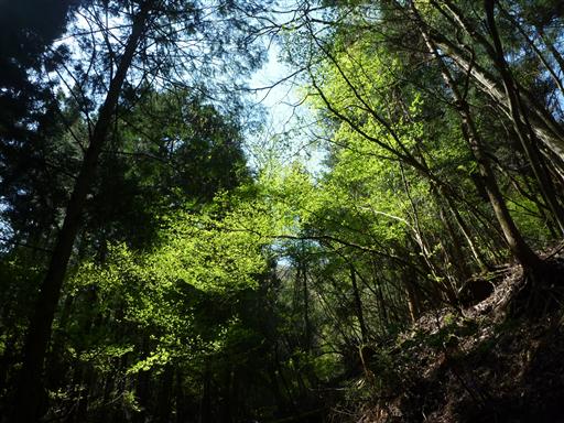薄暗い植林地帯の中で、新緑が一際眩しい。